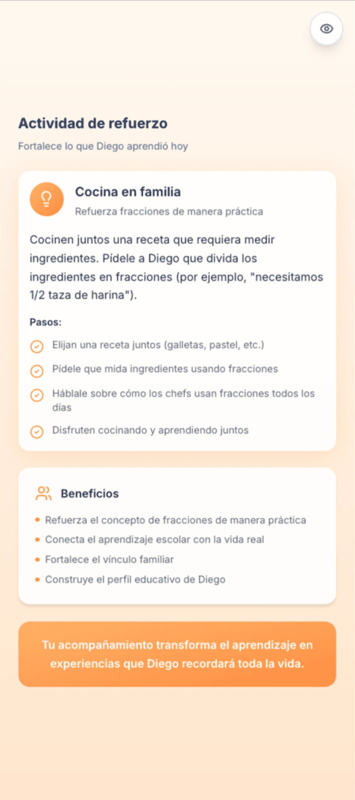 Nuvia te sugiere actividades cercanas, simples o personalizadas para reforzar juntos lo aprendido, sin esfuerzo extra.